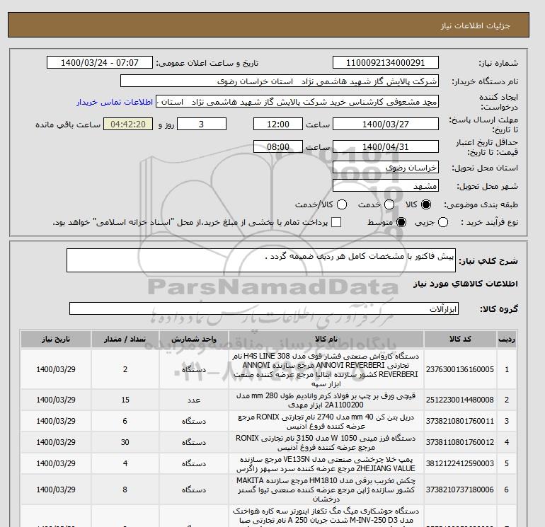 نام دستگاه خریدار:شرکت پالایش گاز شهید هاشمی نژاد استان خراسان رضوی