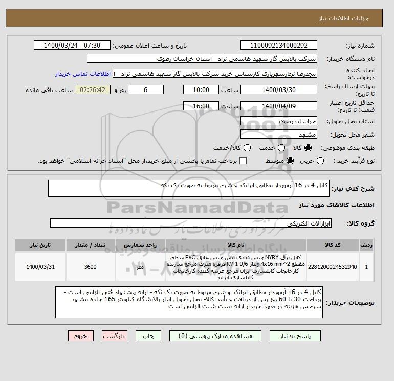 شرح کلی نیاز: کابل 4 در 16 آرموردار مطابق ایرانکد و شرح مربوط به صورت یک تکه