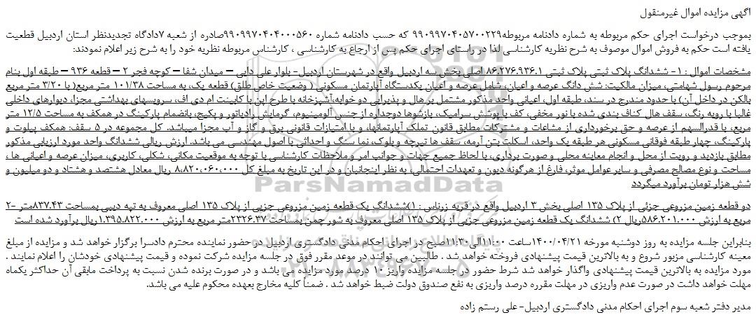 2- دو قطعه زمین مزروعی جزئی از پلاک 135 اصلی بخش 3 اردبیل واقع در قریه زرناس : 1)ششدانگ یک قطعه زمین مزروعی جزیی از پلاک 135 اصلی معروف به تپه دیبی بمساحت 837.43متر مربع به ارزش 586.201.000ریال 2) ششدانگ یک قطعه زمین مزروعی جزیی از پلاک 135 اصلی معروف به شور چمن بمساحت 2326.37متر مربع به ارزش 1.395.822.000ریال برآورد شده است