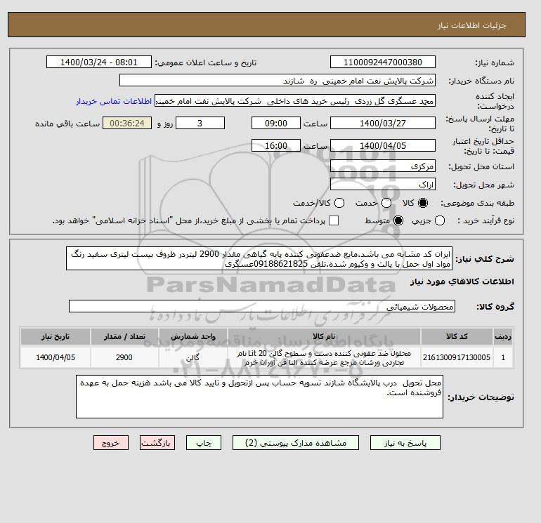 شرح کلی نیاز: ایران کد مشابه می باشد.مایع ضدعفونی کننده پایه گیاهی مقدار 2900 لیتردر ظروف بیست لیتری سفید رنگ مواد اول حمل با پالت و وکیوم شده.تلفن 09188621825عسگری