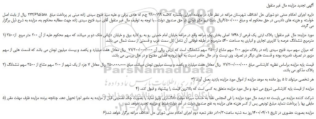 دایره اجرای احکام مدنی دو شورای حل اختلاف شهرستان مراغه در نظر دارد در پرونده اجرایی بشماره کلاسه 9900199 ج.م له هادی برقی و علیه سید فتوح سیدی زاده مبنی بر پرداخت مبلغ  223/695/588 ریال از بابت اصل خواسته و هزینه های دادرسی در حق محکوم له و مبلغ 6/500/000ریال بابت نیم عشر دولتی در حق صندوق دولت ، با توجه به توقیف مال غیر منقول آقای سید فتوح سیدی زاده جهت مطالبه محکوم به، مزایده به شرح ذیل برگزار می گردد.