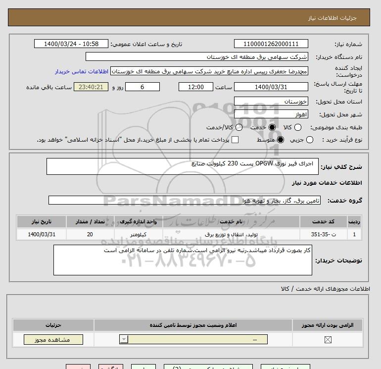 شرح کلی نیاز: اجرای فیبر نوری OPGW پست 230 کیلوولت صنایع