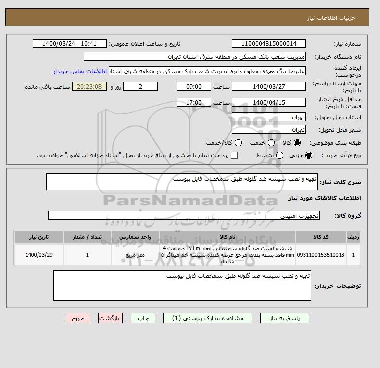 نام دستگاه خریدار:مدیریت شعب بانک مسکن در منطقه شرق استان تهران
