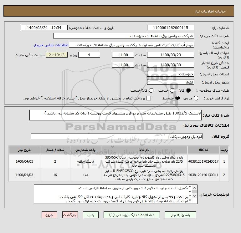 شرح کلی نیاز: لاستیک 13R22/5 طبق مشخصات مندرج در فرم پیشنهاد قیمت پیوست (ایران کد مشابه می باشد )
