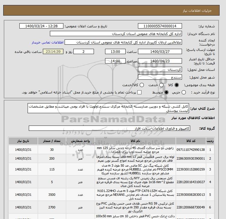 استعلام بها و موضوع استعلام استعلام کابل کشی شبکه و دوربین مداربسته کتابخانه مرکزی سنندج.اولویت با افراد بومی میباشد.و مطابق مشخصات لیست پیوستی به اطلاع کلیه شرکت‌ها و افراد متخصص واجد شرایط می‌رساند، آگهی گذار در نظر دارد از طریق استعلام بها، نسبت به انتخاب و دریافت پیشنهادات اقدام نماید. این استعلام با کد آگهی ثبت شده در سامانه خبرگزاری پارس نماد : 3500766 منتشر شده است. مشخصات استعلام : تاریخ شروع استعلام: 1400/03/24 آخرین مهلت ارسال پیشنهاد قیمت : 1400/03/26 و محل اجرای پروژه : استان کردستان میباشد. استعلام قیمت مورد درخواست : استعلام کابل کشی شبکه و دوربین مداربسته کتابخانه مرکزی سنندج.اولویت با افراد بومی میباشد.و مطابق مشخصات لیست پیوستی با دسته‌بندی‌های تخصصی و گروه های مرتبط : پیمانکاری برق و الکترونیک, سیم و کابل, سینی و نردبان کابل, سیستم های حفاظتی-دوربین مدار بسته،دزدگیر،آیفون تصویری و آنتن مرکزی, کامپیوتر, اینترنت شبکه, لوله و اتصالات, تجهیزات برق و الکترونیک, استعلام اطلاع رسانی میگردد.
