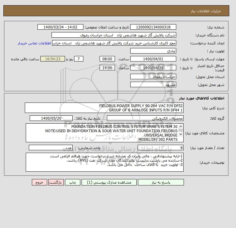 نام دستگاه خریدار:شرکت پالایش گاز شهید هاشمی نژاد استان خراسان رضوی