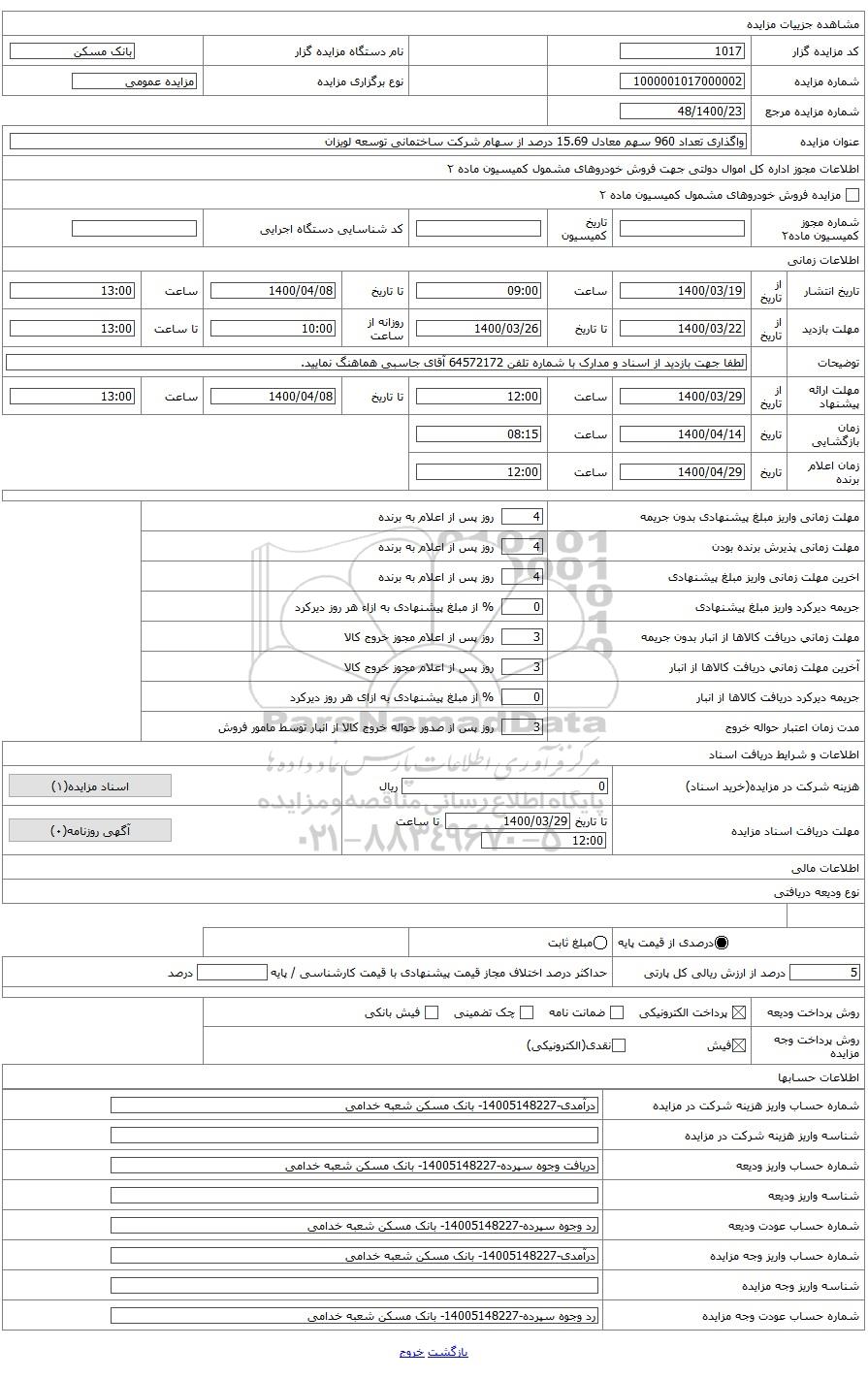 کد مزایده گزار | 1017 | نام دستگاه مزایده گزار | بانک مسکن | |
