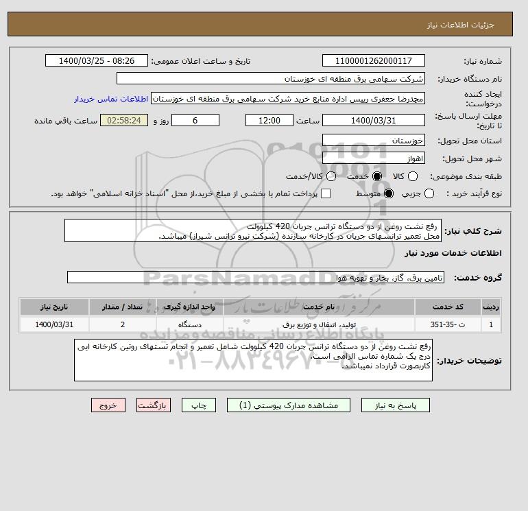 شرح کلی نیاز: رفع نشت روغن از دو دستگاه ترانس جریان 420 کیلوولت