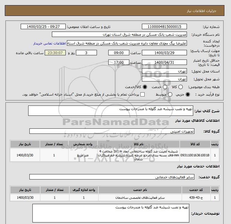 نام دستگاه خریدار:مدیریت شعب بانک مسکن در منطقه شرق استان تهران