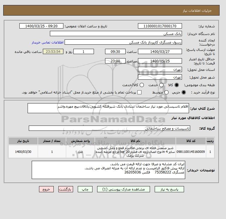 شرح کلی نیاز: اقلام تاسیساتی مورد نیاز ساختمان ستادی بانک شیرفلکه کشویی،یاتاقان،پیچ مهره،واشر