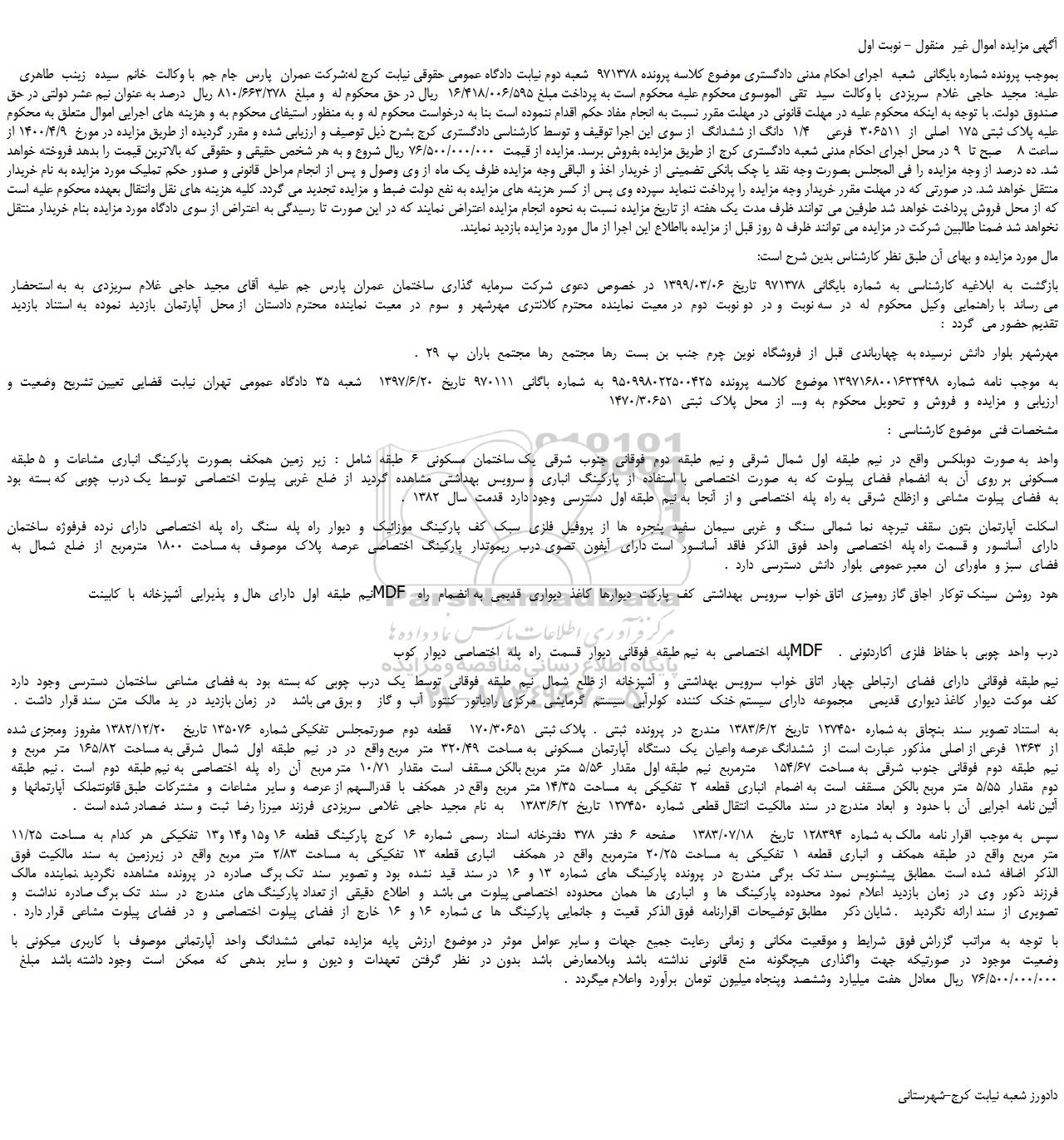 بموجب پرونده شماره بایگانی  شعبه  اجرای احکام مدنی دادگستری موضوع کلاسه پرونده 971378  شعبه دوم نیابت دادگاه عمومی حقوقی نیابت کرج له:شرکت عمران  پارس  جام جم  با وکالت  خانم  سیده  زینب  طاهری    علیه:  مجید  حاجی  غلام  سریزدی  با وکالت  سید  تقی  الموسوی محکوم علیه محکوم است به پرداخت مبلغ 16/418/006/595  ریال در حق محکوم له  و مبلغ  810/663/278 ریال  درصد به عنوان نیم عشر دولتی در حق صندوق دولت. با توجه به اینکه محکوم علیه در مهلت قانونی در مهلت مقرر نسبت به انجام مفاد حکم اقدام ننموده است بنا به درخواست محکوم له و به منظور استیفای محکوم به و هزینه های اجرایی اموال متعلق به محکوم علیه پلاک ثبتی 175  اصلی  از  306511  فرعی    1/4  دانگ از ششدانگ  از سوی این اجرا توقیف و توسط کارشناسی دادگستری کرج بشرح ذیل توصیف و ارزیابی شده و مقرر گردیده از طریق مزایده در مورخ  1400/4/9 از ساعت 8    صبح تا  9 در محل اجرای احکام مدنی شعبه دادگستری کرج از طریق مزایده بفروش برسد. مزایده از قیمت  76/500/000/000 ریال شروع و به هر شخص حقیقی و حقوقی که بالاترین قیمت را بدهد فروخته خواهد شد. ده درصد از وجه مزایده را فی المجلس بصورت وجه نقد یا چک بانکی تضمینی از خریدار اخذ و الباقی وجه مزایده ظرف یک ماه از وی وصول و پس از انجام مراحل قانونی و صدور حکم تملیک مورد مزایده به نام خریدار منتقل خواهد شد. در صورتی که در مهلت مقرر خریدار وجه مزایده را پرداخت ننماید سپرده وی پس از کسر هزینه های مزایده به نفع دولت ضبط و مزایده تجدید می گردد. کلیه هزینه های نقل وانتقال بعهده محکوم علیه است که از محل فروش پرداخت خواهد شد طرفین می توانند ظرف مدت یک هفته از تاریخ مزایده نسبت به نحوه انجام مزایده اعتراض نمایند که در این صورت تا رسیدگی به اعتراض از سوی دادگاه مورد مزایده بنام خریدار منتقل نخواهد شد ضمنا طالبین شرکت در مزایده می توانند ظرف 5 روز قبل از مزایده بااطلاع این اجرا از مال مورد مزایده بازدید نمایند.