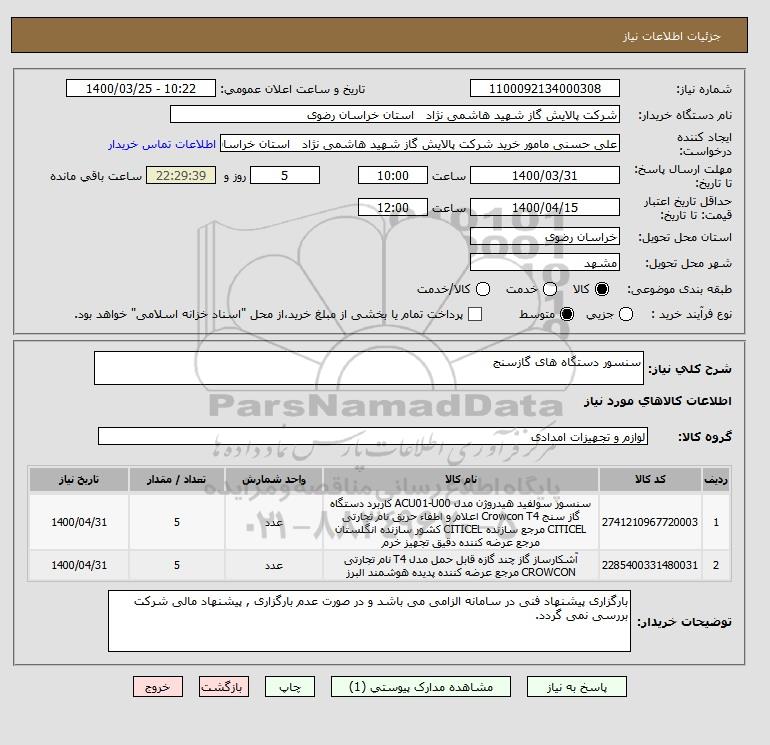 نام دستگاه خریدار:شرکت پالایش گاز شهید هاشمی نژاد استان خراسان رضوی