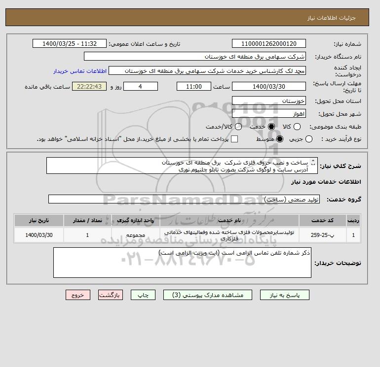 شرح کلی نیاز: ساخت و نصب حروف فلزی شرکت برق منطقه ای خوزستان آدرس سایت و لوگوی شرکت بصورت تابلو چلنیوم نوری