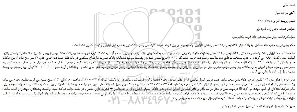 بنابر این در اجرای ماده 114 قانون اجرای احکام مدنی موعد مزایده جهت فروش اموال توقیفی که با حضور نماینده محترم دادسرا برگزار خواهد شد ، مزایده در روز یکشنبه مورخه 1400/04/13 از ساعت 11:00الی11:30 صبح تعیین می گردد. طالبین محترم می تواند یک ساعت قبل از انجام مزایده با پرداخت میزان ده در صد مبلغ پشنهادی از ارزش کارشناسی معینه به شماره 2171290841006 حساب سپرده دادگستری اردبیل نزد بانک ملی واریز ودر جلسه مزایده شرکت نمایند .بدیهی است به استثناء برنده مزایده ، وجه واریزی سایر شرکت کنندگان فی الفور عودت می گردد لذا در موعد مقرر در محل مزایده واقع در دفتر شعبه اول اجرای احکام مدنی دادگاه حقوقی اردبیل واقع در کارشناسان – شهرک اداری حاضر و در جلسه مزایده شرکت نموده و قیمت پیشنهادی خودشان را اعلام نمایند . مزایده از قیمتی که کارشناس محترم تعیین نموده شروع و به بالاترین قیمت پیشنهادی فروخته خواهد شد.برنده مزایده ظرف یک ماه نسبت به پرداخت بقیه بهای اموال اقدام می نماید . چنانچه برنده مزایده در موعد مقرر بقیه بهای اموال را نپردازد سپرده او پس از کسر هزینه مزایده به نفع دولت ضبط و مزایده تجدید خواهد . ضمنا" کلیه مخارج مزایده بر عهده محکوم علیه می باشد.