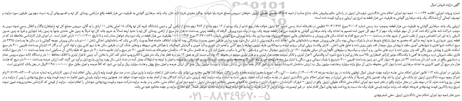 شماره پرونده اجرایی: کلاسه 0000143 شعبه دوم اجرای احکام مدنی دادگستری شهرستان اردبیل در راستای حکم برفروش ملک مشاع صادره از شعبه 5 دادگاه عمومی حقوقی اردبیل ،خواهان :سیروس مصلح فرزند بابا خوانده: چنگیز مجیدی فرزند تازه خان، یک واحد مرغداری گوشتی به ظرفیت سی هزار قطعه واقع دراراضی روستای کل تپه و تقسیم بهای آن به نسبت سهم بین طرفین ،مورد مزایده و توصیف اجمالی آن:ششدانگ یک واحد مرغداری گوشتی به ظرفیت سی هزار قطعه به شرح زیر ارزیابی و برآورد قیمت شده است؛