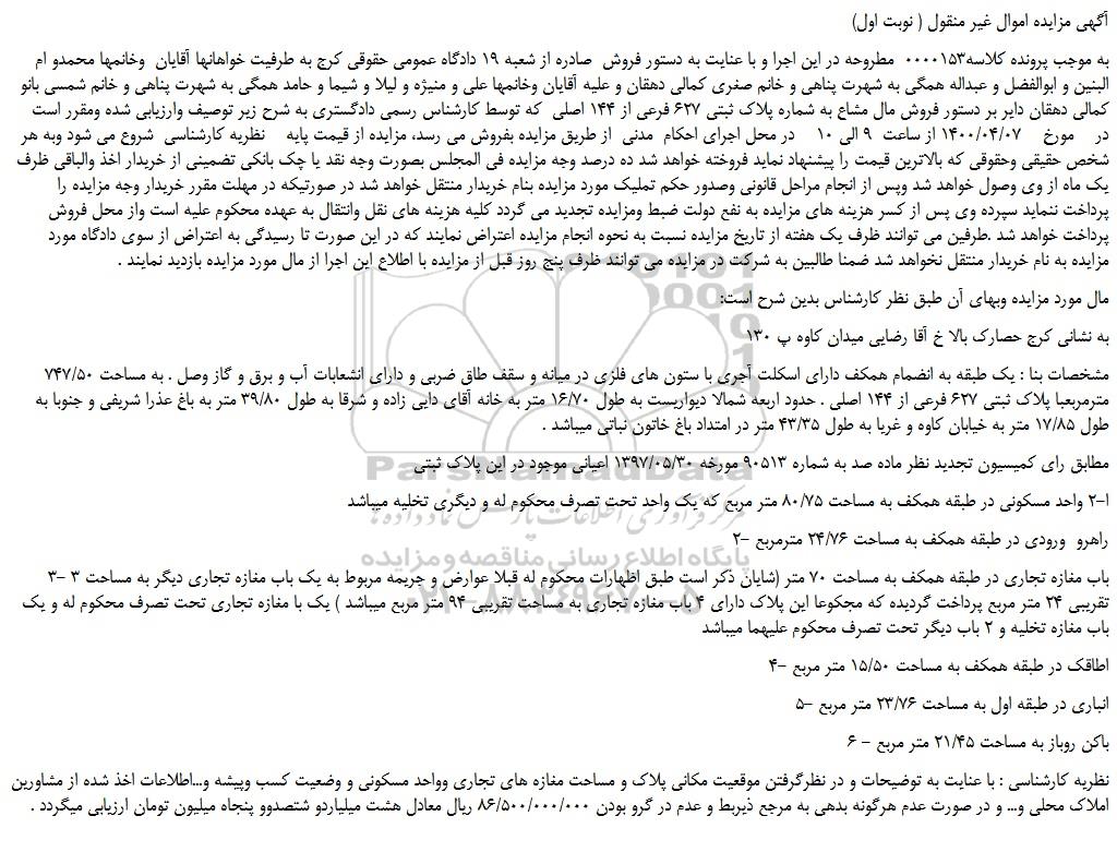 به موجب پرونده کلاسه0000153 مطروحه در این اجرا و با عنایت به دستور فروش صادره از شعبه 19 دادگاه عمومی حقوقی کرج به طرفیت خواهانها آقایان وخانمها محمدو ام البنین و ابوالفضل و عبداله همگی به شهرت پناهی و خانم صغری کمالی دهقان و علیه آقایان وخانمها علی و منیژه و لیلا و شیما و حامد همگی به شهرت پناهی و خانم شمسی بانو کمالی دهقان دایر بر دستور فروش مال مشاع به شماره پلاک ثبتی 627 فرعی از 144 اصلی که توسط کارشناس رسمی دادگستری به شرح زیر توصیف وارزیابی شده ومقرر است در مورخ 1400/04/07 از ساعت 9 الی 10 در محل اجرای احکام مدنی از طریق مزایده بفروش می رسد، مزایده از قیمت پایه نظریه کارشناسی شروع می شود وبه هر شخص حقیقی وحقوقی که بالاترین قیمت را پیشنهاد نماید فروخته خواهد شد ده درصد وجه مزایده فی المجلس بصورت وجه نقد یا چک بانکی تضمینی از خریدار اخذ والباقی ظرف یک ماه از وی وصول خواهد شد وپس از انجام مراحل قانونی وصدور حکم تملیک مورد مزایده بنام خریدار منتقل خواهد شد در صورتیکه در مهلت مقرر خریدار وجه مزایده را پرداخت ننماید سپرده وی پس از کسر هزینه های مزایده به نفع دولت ضبط ومزایده تجدید می گردد کلیه هزینه های نقل وانتقال به عهده محکوم علیه است واز محل فروش پرداخت خواهد شد .طرفین می توانند ظرف یک هفته از تاریخ مزایده نسبت به نحوه انجام مزایده اعتراض نمایند که در این صورت تا رسیدگی به اعتراض از سوی دادگاه مورد مزایده به نام خریدار منتقل نخواهد شد ضمنا طالبین به شرکت در مزایده می توانند ظرف پنج روز قبل از مزایده با اطلاع این اجرا از مال مورد مزایده بازدید نمایند .