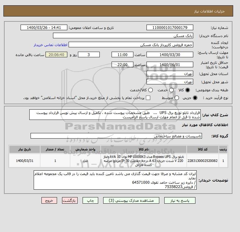 شرح کلی نیاز: قرارداد تابلو توزیع برق UPS ... طبق مشخصات پیوست شده ، تکمیل و ارسال پیش نویس قرارداد پیوست شده تا قبل از اتمام مهلت ارسال پاسخ الزامیست