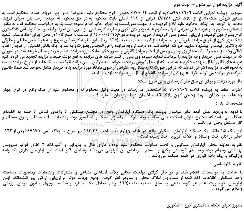 بموجب پرونده اجرایی کلاسه 9901606صادره از شعبه 14 دادگاه حقوقی کرج محکوم علیه : علیرضا قمر پور فرزند صمد محکوم است به دستور فروش ملک مشاع از پلاک ثبتی 47171 فرعی از 162 اصلی بابت محکوم به در حق محکوم له مهدیه رحیم یان سرای فرزند محمد با توجه به اینکه محکوم علیه ابلاغ گردیده و در مهلت مقررنسبت به اجرای حکم اقدام ننموده است بنا به درخواست محکوم له و به منظور استیفای محکوم به و هزینه های اجرایی اموال محکوم علیه برابر متن آگهی و نظریه کارشناسی از سوی این اجرا توقیف توسط کارشناس دادگستری کرج بشرح ذیل توصیف و ارزیابی شده و مقرر گردیده از طریق مزایده درمورخ1400/04/15 از ساعت 9 صبح تا10در محل اجرای احکام مدنی شعبه دادگستری کرج از طریق مزایده بفروش برسد. مزایده از قیمت16/400/000/000 ریال طبق نظریه کارشناس شروع و به هر شخص حقیقی و حقوقی که بالاترین قیمت را پیشنهاد نمایید فروخته خواهد شد. ده درصد از وجه مزایده را فی المجلس بصورت وجه نقد یا چک بانکی تضمینی از خریدار اخذ و الباقی وجه مزایده ظرف یک ماه از وی وصول و پس از انجام مراحل قانونی و صدور حکم تملیک مورد مزایده به نام خریدار منتقل خواهد شد. در صورتی که در مهلت مقرر خریدار وجه مزایده را پرداخت ننماید سپرده وی پس از کسر هزینه های مزایده به نفع دولت ضبط و مزایده تجدید می گردد. کلیه هزینه های نقل وانتقال بعهده محکوم علیه است که از محل فروش پرداخت خواهد شد طرفین می توانند ظرف مدت یک هفته از تاریخ مزایده نسبت به نحوه انجام مزایده اعتراض نمایند که در این صورت تا رسیدگی به اعتراض از سوی دادگاه مورد مزایده بنام خریدار منتقل نخواهد شد ضمنا طالبین شرکت در مزایده می توانند ظرف 5 روز قبل از مزایده بااطلاع از مال مورد مزایده بازدید نمایند.