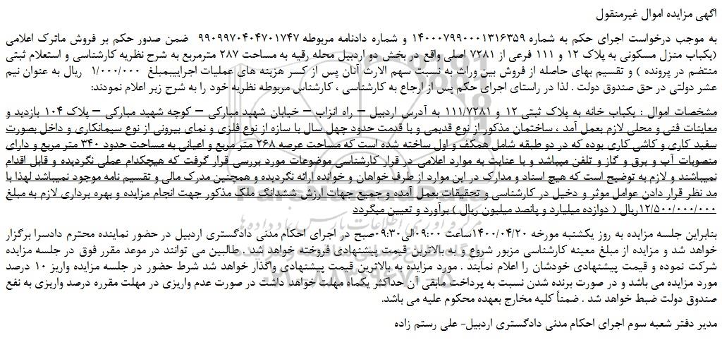 به موجب درخواست اجرای حکم به شماره 140007990001316359 و شماره دادنامه مربوطه 9909970404701747 ضمن صدور حکم بر فروش ماترک اعلامی (یکباب منزل مسکونی به پلاک 12 و 111 فرعی از 7281 اصلی واقع در بخش دو اردبیل محله رقیه به مساحت 287 مترمربع به شرح نظریه کارشناسی و استعلام ثبتی منتضم در پرونده ) و تقسیم بهای حاصله از فروش بین وراث به نسبت سهم الارث آنان پس از کسر هزینه های عملیات اجراییبمبلغ 1/000/000 ریال به عنوان نیم عشر دولتی در حق صندوق دولت . لذا در راستای اجرای حکم پس از ارجاع به کارشناسی ، کارشناس مربوطه نظریه خود را به شرح زیر اعلام نمودند: