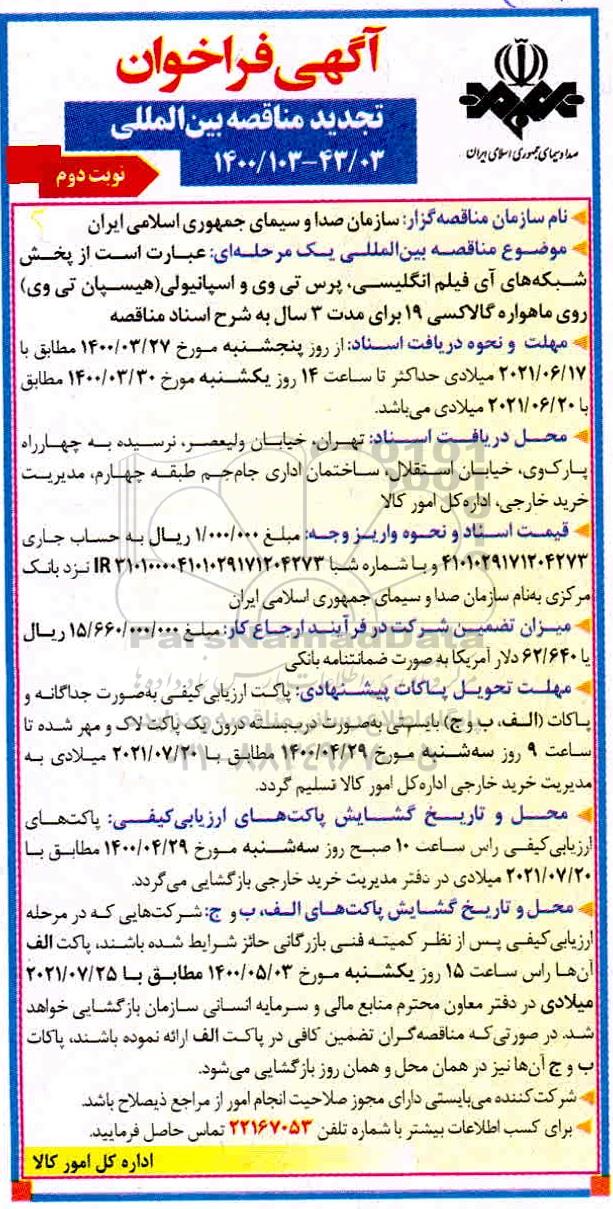 - موضوع مناقصه بین المللی یک مرحله ای: عبارت است از پخش شبکه های آی فیلم انگلیسی، پرس تی وی و اسپانیولی (هیسپان تی وی) روی ماهواره گالاکسی 19 برای مدت 3 سال به شرح اسناد مناقصه