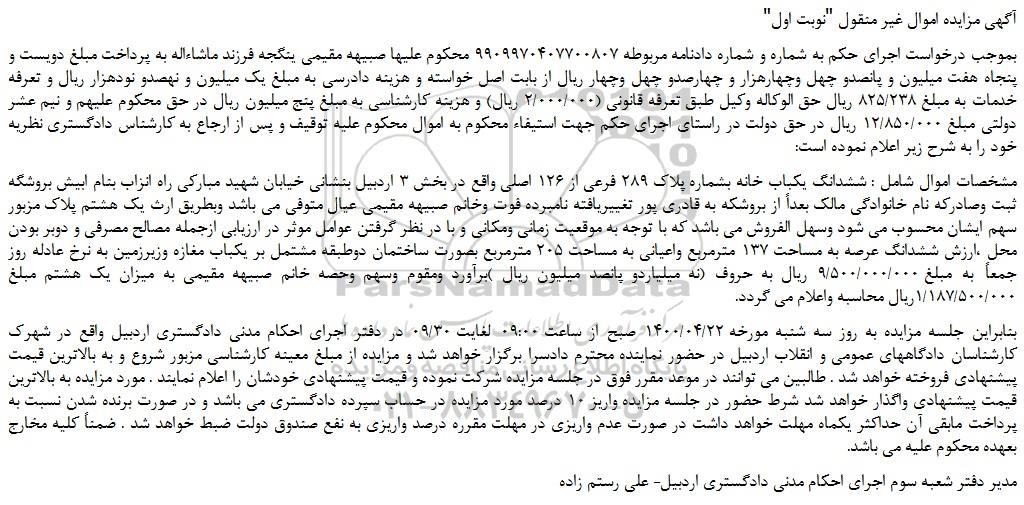 بنابراین جلسه مزایده به روز سه شنبه مورخه 1400/04/22 صبح از ساعت 09:00 لغایت 09/30 در دفتر اجرای احکام مدنی دادگستری اردبیل واقع در شهرک کارشناسان دادگاههای عمومی و انقلاب اردبیل در حضور نماینده محترم دادسرا برگزار خواهد شد و مزایده از مبلغ معینه کارشناسی مزبور شروع و به بالاترین قیمت پیشنهادی فروخته خواهد شد . طالبین می توانند در موعد مقرر فوق در جلسه مزایده شرکت نموده و قیمت پیشنهادی خودشان را اعلام نمایند . مورد مزایده به بالاترین قیمت پیشنهادی واگذار خواهد شد شرط حضور در جلسه مزایده واریز 10 درصد مورد مزایده در حساب سپرده دادگستری می باشد و در صورت برنده شدن نسبت به پرداخت مابقی آن حداکثر یکماه مهلت خواهد داشت در صورت عدم واریزی در مهلت مقرره درصد واریزی به نفع صندوق دولت ضبط خواهد شد . ضمناً کلیه مخارج بعهده محکوم علیه می باشد.