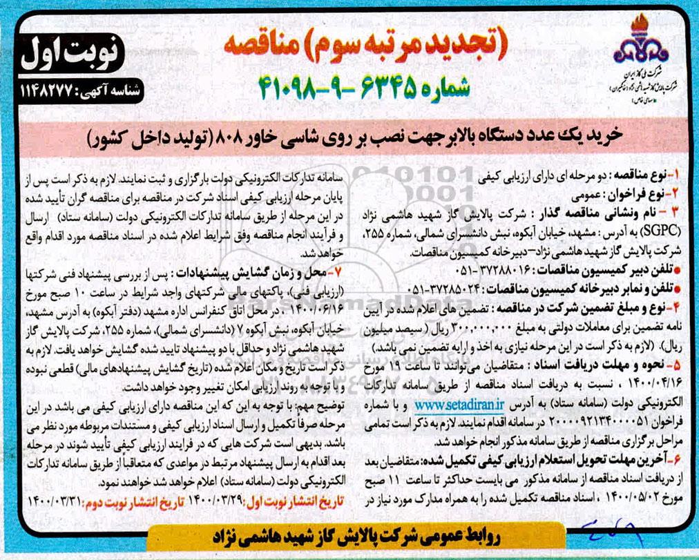 3 – نام ونشانی مناقصه‌گزار: شرکت پالایش گاز شهید هاشمی نژاد (SGPC) به آدرس: مشهد، خیابان آبکوه، نبش دانشسرای شمالی، شماره 255، شرکت پالایش گاز شهید هاشمی نژاد– دبیرخانه کمیسیون مناقصات.