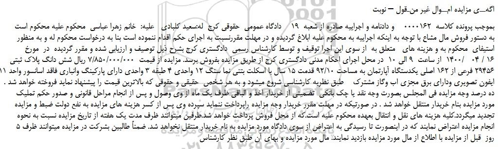 بموجب پرونده کلاسه 0000162 و دادنامه و اجراییه صادره از شعبه 19 دادگاه عمومی حقوقی کرج له:سعید کلبادی علیه: خانم زهرا عباسی محکوم علیه محکوم است به دستور فروش مال مشاع با توجه به اینکه اجراییه به محکوم علیه ابلاغ گردیده و در مهلت مقررنسبت به اجرای حکم اقدام ننموده است بنا به درخواست محکوم له و به منظور استیفای محکوم به و هزینه های متعلق به از سوی این اجرا توقیف و توسط کارشناس رسمی دادگستری کرج بشرح ذیل توصیف و ارزیابی شده و مقرر گردیده در مورخ 16 / 04 /1400 از ساعت 9 الی 10 در محل اجرای احکام مدنی دادگستری کرج از طریق مزایده بفروش برسد. مزایده از قیمت 7/850/000/000 ریال شش دانگ پلاک ثبتی 29456 فرعی از 162 اصلی یکدستگاه آپارتمان به مساحت 92/10 قدمت 15 سال با اسکلت بتنی نما سنگ 12 واحدی 4 طبقه 3 واحدی دارای پارکینگ وانباری فاقد اسانسور واحد 11 ایفون تصویری ودارای برق مجزی اب وگاز مشترک طبق نظریه کارشناسی شروع میشود و به هر شخص حقیقی و حقوقی که بالاترین قیمت را پیشنهاد نماید فروخته خواهد شد . ده درصد وجه مزایده فی المجلس بصورت وجه نقد یا چک بانکی تضمینی از خریدار اخذ و الباقی ظرف یک ماه از وی وصول و پس از انجام مراحل قانونی و صدور حکم تملیک مورد مزایده بنام خریدار منتقل خواهد شد . در صورتیکه در مهلت مقرر خریدار وجه مزایده راپرداخت ننماید سپرده وی پس از کسر هزینه های مزایده به نفع دولت ضبط و مزایده تجدید میگردد.کلیه هزینه های نقل و انتقال بعهده محکوم علیه است.که از محل فروش پرداخت خواهد شد.طرفین میتوانند ظرف مدت یک هفته از تاریخ مزایده نسبت به نحوه انجام مزایده اعتراض نمایند که در اینصورت تا رسیدگی به اعتراض از سوی دادگاه مورد مزایده به نام خریدار منتقل نخواهد شد. ضمناً طالبین بشرکت در مزایده میتوانند ظرف 5 روز قبل از مزایده با اطلاع از مال مورد مزایده بازدید نمایند. مال مورد مزایده و بهای آن طبق نظر کارشناس
