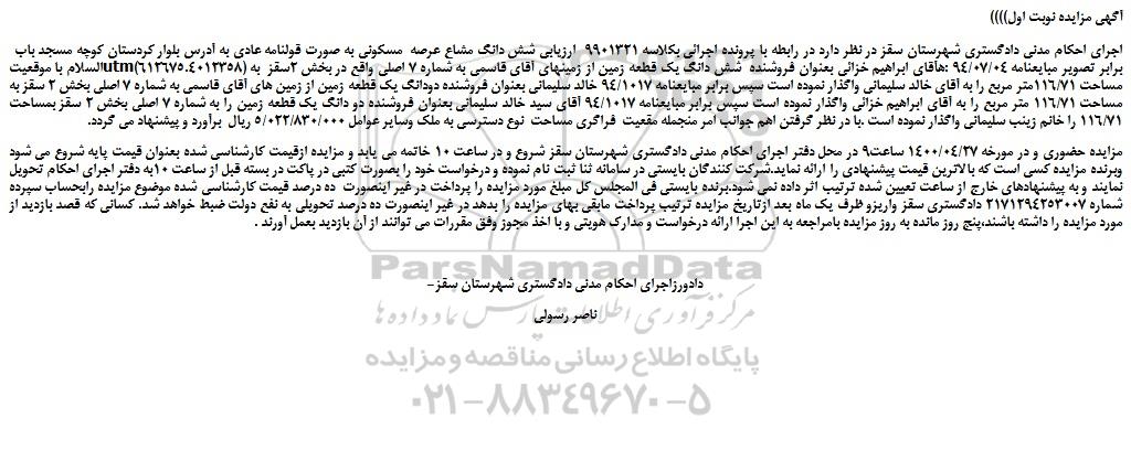 اجرای احکام مدنی دادگستری شهرستان سقز در نظر دارد در رابطه با پرونده اجرائی بکلاسه 9901321  ارزیابی شش دانگ مشاع عرصه  مسکونی به صورت قولنامه عادی به آدرس بلوار کردستان کوچه مسجد باب السلام با موقعیتutm(612675.4012358) برابر تصویر مبایعنامه 94/07/04 :هآقای ابراهیم خزائی بعنوان فروشنده  شش دانگ یک قطعه زمین از زمینهای آقای قاسمی به شماره 7 اصلی واقع در بخش 2سقز  به مساحت 116/71متر مربع را به آقای خالد سلیمانی واگذار نموده است سپس برابر مبایعنامه 94/1017 خالد سلیمانی بعنوان فروشنده دودانگ یک قطعه زمین از زمین های آقای قاسمی به شماره 7 اصلی بخش 2 سقز به مساحت 116/71 متر مربع را به آقای ابراهیم خزائی واگذار نموده است سپس برابر مبایعنامه 94/1017 آقای سید خالد سلیمانی بعنوان فروشنده دو دانگ یک قطعه زمین را به شماره 7 اصلی بخش 2 سقز بمساحت 116/71 را خانم زینب سلیمانی واگذار نموده است .با در نظر گرفتن اهم جوانب امر منجمله مقعیت  فراگری مساحت  نوع دسترسی به ملک وسایر عوامل 5/022/830/000 ریال  برآورد و پیشنهاد می گردد.