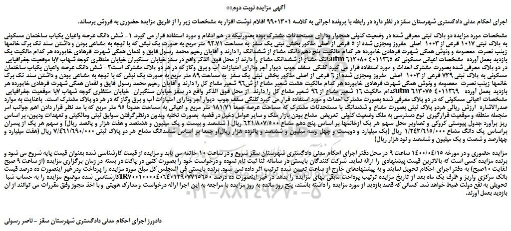 مشخصات مورد مزایده دو پلاک ثبتی معرفی شده در وضعیت کنونی همجوار ودارای مستحدثات مشترک بوده بصورتیکه در هم ادغام و مورد استفاده قرار می گیرد. 1- شش دانگ عرصه واعیان یکباب ساختمان مسکونی به پلاک ثبتی 1017 فرعی از 1003 اصلی مفروز ومجزی شده از 5 فرعی از اصلی مذکور بخش ثبتی یک سقز به مساحت 92.71 متر مربع به صورت یک نبش که با توجه به مشاعی بودن و داشتن سند تک برگ خانمها زینب نصرت معصومه و ونوش همگی شهرت فرهادی خاپورده هر کدام مالکیت پنج دهم دانگ مشاع از ششدانگ را دارند و آقایان رحیم محمد رسول فایق و لقمان همگی شهرت فرهادی خاپورده هر کدام مالکیت یک دانگ مشاع از ششدانگ مشاع را دارند از محل فوق الذکر واقع در سقز خیابان سنگبران خیابان منتظری کوچه شهاب 7با موقعیت جغرافیایی utm 613080 4011265 بازدید بعمل آورده مشخصات اعیانی مسکونی که در دو پلاک معرفی شده بصورت مشترک احداث و مورد استفاده قرار می گیرد کلنگی سقف چوب دیوار آجر ودارای امتیازات آب و برق وگاز که در هر دو پلاک مشترک است2- شش دانگ عرصه واعیان یکباب ساختمان مسکونی به پلاک ثبتی 739 فرعی از 1003 اصلی مفروز ومجزی شده از 6 فرعی از اصلی مذکور بخش ثبتی یک سقز به مساحت 89 متر مربع به صورت یک نبش که با توجه به مشاعی بودن و داشتن سند تک برگ خانمها زینب نصرت معصومه و ونوش همگی شهرت فرهادی خاپورده هر کدام مالکیت هشت شعیر مشاع از ش96 شعیر مشاع کل را دارند و آقایان رحیم محمد رسول فایق و لقمان همگی شهرت فرهادی خاپورده هر کدام مالکیت 16 شعیر مشاع از 96 شعیر مشاع کل را دارند از محل فوق الذکر واقع در سقز خیابان سنگبران خیابان منتظری کوچه شهاب 7با موقعیت جغرافیایی utm 613075 4011269 بازدید بعمل آورده مشخصات اعیانی مسکونی که در دو پلاک معرفی شده بصورت مشترک احداث و مورد استفاده قرار می گیرد کلنگی سقف چوب دیوار آجر ودارای امتیازات آب و برق وگاز که در هر دو پلاک مشترک است. باعنایت به موارد صدرالاشاره ارزش ریالی هردو پلاک ثبتی بصورت مشاع و ششدانگ با مستحدثات مشترک که مساحت عرصه جمعاً 181/71 متر مربع و اعیانی به مساحت حدوداً 95 متر مربع که با مد نظر قرار دادن اهم جوانب امر منجمله منطقه و موقعیت قرارگیری نوع دسترسی به ملک وضعیت کنونی تعریض مشاع بودن بازار ملک و سایر عوامل دخیل در قضیه بصورت تخلیه وبدون درنظرگرفتن سوابق ثبتی ومالکیتی و تعهدات ودیون، بر اساس ریز برآورد جدول پیوستی کروکی و تصاویر محل سهم هر یک ازخانمها بر اساس پنج دهم مشاع 621/807/500 ریال ( ششصد و بیست و یک میلیون و هشتصد و هفت هزار و پانصد ریال) و سهم هر یک از پسران براساس یک دانگ مشاع 1/243/615/000 ریال (یک میلیارد و دویست و چهل وسه میلیون و ششصد و پانزده هزار ریال)و جمعا بر اساس ششدانگ مشاع هر دو پلاک ثبتی 7/461/690/000 ریال (هفت میلیارد و چهارصد و شصت و یک میلیون و ششصد و نود هزار ریال)
