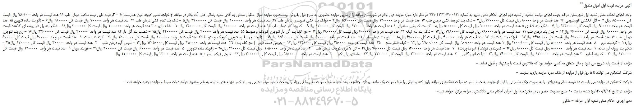 "آگهی مزایده نوبت اول اموال منقول"