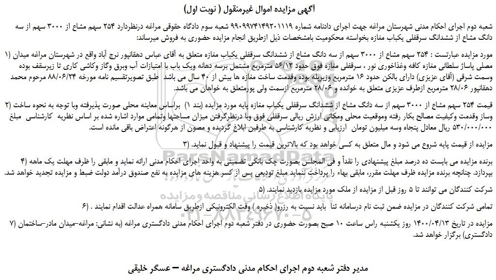 شعبه دوم اجرای احکام مدنی شهرستان مراغه جهت اجرای دادنامه شماره 9909974149201119 شعبه سوم دادگاه حقوقی مراغه درنظردارد 254 سهم مشاع از 3000 سهم از سه دانگ مشاع از ششدانگ سرقفلی یکباب مغازه بخواسته محکومیت بامشخصات ذیل ازطریق انجام مزایده حضوری به فروش میرساند: