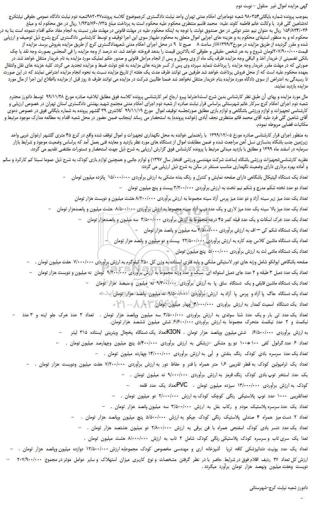 بموجب پرونده شماره بایگانی980354 شعبه دوماجرای احکام مدنی تهران واحد نیابت دادگستری کرجموضوع کلاسه پرونده982037شعبه دوم نیابت دادگاه عمومی حقوقی نیابتکرج له:شاهین گلی فرد  با وکالت خانم فاطمه کاوند علیه:  محمد قاسم منتظری محکوم علیه محکوم است به پرداخت مبلغ 1/935/760/735 ریال در حق محکوم له و مبلغ 156/824/036 ریال به عنوان نیم عشر دولتی در حق صندوق دولت. با توجه به اینکه محکوم علیه در مهلت قانونی در مهلت مقرر نسبت به انجام مفاد حکم اقدام ننموده است بنا به درخواست محکوم له و به منظور استیفای محکوم به و هزینه های اجرایی اموال متعلق به محکوم علیهاز سوی این اجرا توقیف و توسط کارشناسی دادگستری کرج بشرح ذیل توصیف و ارزیابی شده و مقرر گردیده از طریق مزایده در مورخ81399/3/از ساعت 8    صبح تا  9 در محل اجرای احکام مدنی شعبهدادگستری کرج از طریق مزایده بفروش برسد. مزایده از قیمت207/900/000تومان شروع و به هر شخص حقیقی و حقوقی که بالاترین قیمت را بدهد فروخته خواهد شد. ده درصد از وجه مزایده را فی المجلس بصورت وجه نقد یا چک بانکی تضمینی از خریدار اخذ و الباقی وجه مزایده ظرف یک ماه از وی وصول و پس از انجام مراحل قانونی و صدور حکم تملیک مورد مزایده به نام خریدار منتقل خواهد شد. در صورتی که در مهلت مقرر خریدار وجه مزایده را پرداخت ننماید سپرده وی پس از کسر هزینه های مزایده به نفع دولت ضبط و مزایده تجدید می گردد. کلیه هزینه های نقل وانتقال بعهده محکوم علیه است که از محل فروش پرداخت خواهد شد طرفین می توانند ظرف مدت یک هفته از تاریخ مزایده نسبت به نحوه انجام مزایده اعتراض نمایند که در این صورت تا رسیدگی به اعتراض از سوی دادگاه مورد مزایده بنام خریدار منتقل نخواهد شد ضمنا طالبین شرکت در مزایده می توانند ظرف 5 روز قبل از مزایده بااطلاع این اجرا از مال مورد مزایده بازدید نمایند.