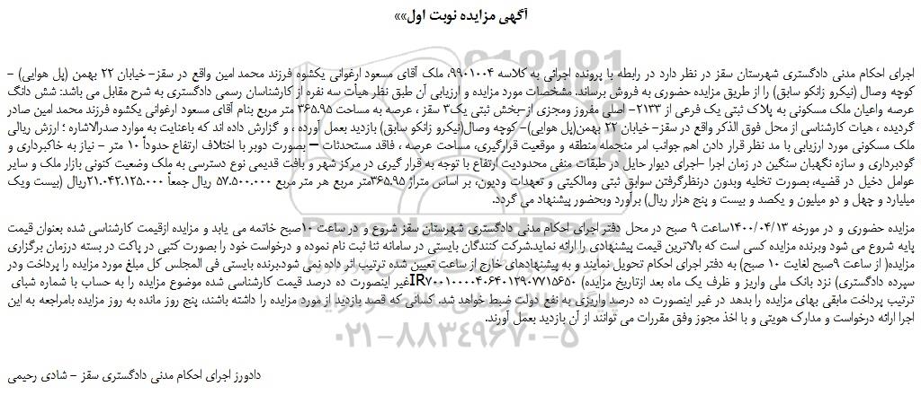 مزایده حضوری و در مورخه 1400/04/13ساعت 9 صبح در محل دفتر اجرای احکام مدنی دادگستری شهرستان سقز شروع و در ساعت 10صبح خاتمه می یابد و مزایده ازقیمت کارشناسی شده بعنوان قیمت پایه شروع می شود وبرنده مزایده کسی است که بالاترین قیمت پیشنهادی را ارائه نماید.شرکت کنندگان بایستی در سامانه ثنا ثبت نام نموده و درخواست خود را بصورت کتبی در پاکت در بسته درزمان برگزاری مزایده( از ساعت 9صبح لغایت 10 صبح) به دفتر اجرای احکام تحویل نمایند و به پیشنهادهای خارج از ساعت تعیین شده ترتیب اثر داده نمی شود.برنده بایستی فی المجلس کل مبلغ مورد مزایده را پرداخت ودر غیر اینصورت ده درصد قیمت کارشناسی شده موضوع مزایده را به حساب با شماره شبای IR700100004064012907715650 (سپرده دادگستری) نزد بانک ملی واریز و ظرف یک ماه بعد ازتاریخ مزایده ترتیب پرداخت مابقی بهای مزایده را بدهد در غیر اینصورت ده درصد واریزی به نفع دولت ضبط خواهد شد. کسانی که قصد بازدید از مورد مزایده را داشته باشند، پنج روز مانده به روز مزایده بامراجعه به این اجرا ارائه درخواست و مدارک هویتی و با اخذ مجوز وفق مقررات می توانند از آن بازدید بعمل آورند.