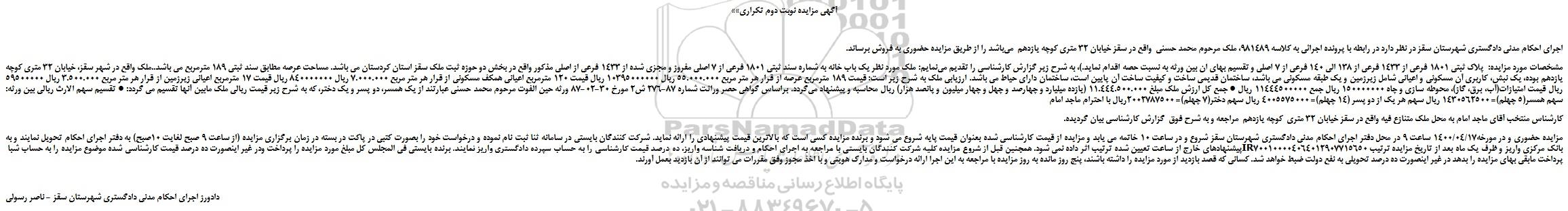 اجرای احکام مدنی دادگستری شهرستان سقز در نظر دارد در رابطه با پرونده اجرائی به کلاسه 981489، ملک مرحوم محمد حسنی  واقع در سقز خیابان 32 متری کوچه یازدهم  می‏باشد را از طریق مزایده حضوری به فروش برساند.