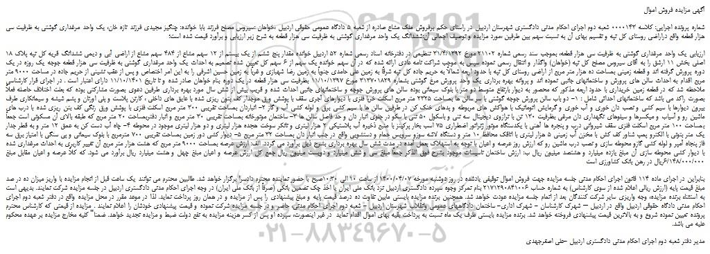 بنابراین در اجرای ماده 114 قانون اجرای احکام مدنی جلسه مزایده جهت فروش اموال توقیفی یادشده در روز دوشنبه مورخه 1400/04/07 از ساعت 10 الی 10:30صبح با حضور نماینده محترم دادسرا برگزار خواهد شد. طالبین محترم می توانند یک ساعت قبل از انجام مزایده با واریز میزان ده در صد مبلغ قیمت پایه (ارزش ریالی اعلام شده از سوی کارشناس) به شماره حساب 2171290841006 بنام تمرکز وجوه سپرده دادگستری اردبیل نزد بانک ملی ایران یا اخذ چک تضمین بانکی (صرفاً از بانک ملی ایران) در وجه اجرای احکام مدنی دادگستری اردبیل در جلسه مزایده شرکت نمایند. بدیهی است به استثناء برنده مزایده، وجه واریزی سایر شرکت کنندگان بعد از اتمام جلسه مزایده عودت خواهد شد. همچنین برنده مزایده بایستی مابین تفاوت ده درصد قیمت پایه و مبلغ پیشنهادی را پس از مزایده و در همان روز پرداخت نماید. لذا در موعد مقرر در محل مزایده واقع در دفتر شعبه دوم اجرای احکام مدنی دادگاه حقوقی اردبیل واقع در اردبیل – شهرک کارشناسان - شهرک اداری- ساختمان دادگاههای عمومی وانقلاب شهرستان اردبیل - شعبه دوم اجرای احکام مدنی، حاضر و در جلسه مزایده شرکت نموده و قیمت پیشنهادی خودشان را اعلام نمایند . مزایده از قیمتی که کارشناس محترم پرونده تعیین نموده شروع و به بالاترین قیمت پیشنهادی فروخته خواهد شد. برنده مزایده بایستی ظرف یک ماه نسبت به پرداخت بقیه بهای اموال اقدام نماید در غیر اینصورت، سپرده او پس از کسر هزینه مزایده به نفع دولت ضبط و مزایده تجدید خواهد. ضمنا" کلیه مخارج مزایده بر عهده محکوم علیه می باشد.