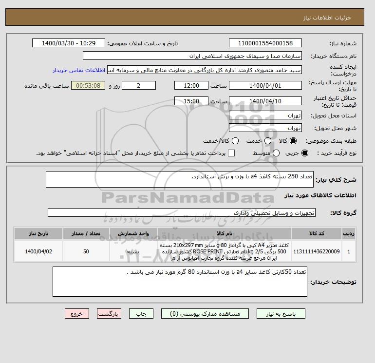 شرح کلی نیاز: تعداد 250 بسته کاغذ a4 با وزن و برش استاندارد.