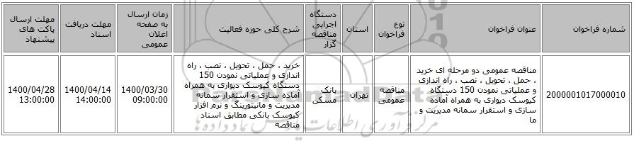2000001017000010 | مناقصه عمومی دو مرحله ای خرید ، حمل ، تحویل ، نصب ، راه اندازی و عملیاتی نمودن 150 دستگاه کیوسک دیواری به همراه آماده سازی و استقرار سمانه مدیریت و ما | مناقصه عمومی | تهران | بانک مسکن | خرید ، حمل ، تحویل ، نصب ، راه اندازی و عملیاتی نمودن 150 دستگاه کیوسک دیواری به همراه آماده سازی و استقرار سمانه مدیریت و مانیتورینگ و نرم افزار کیوسک بانکی مطابق اسناد مناقصه | 1400/03/30 09:00:00 | 1400/04/14 14:00:00 | 1400/04/28 13:00:00 |