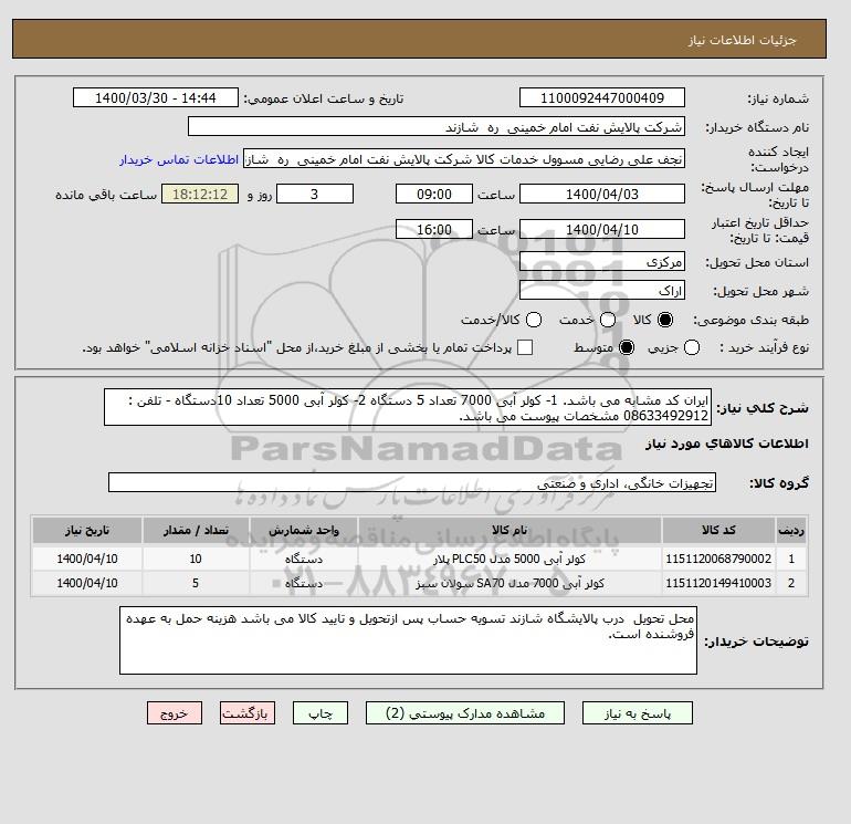 شرح کلی نیاز: ایران کد مشابه می باشد. 1- کولر آبی 7000 تعداد 5 دستگاه 2- کولر آبی 5000 تعداد 10دستگاه - تلفن : 08633492912 مشخصات پیوست می باشد.
