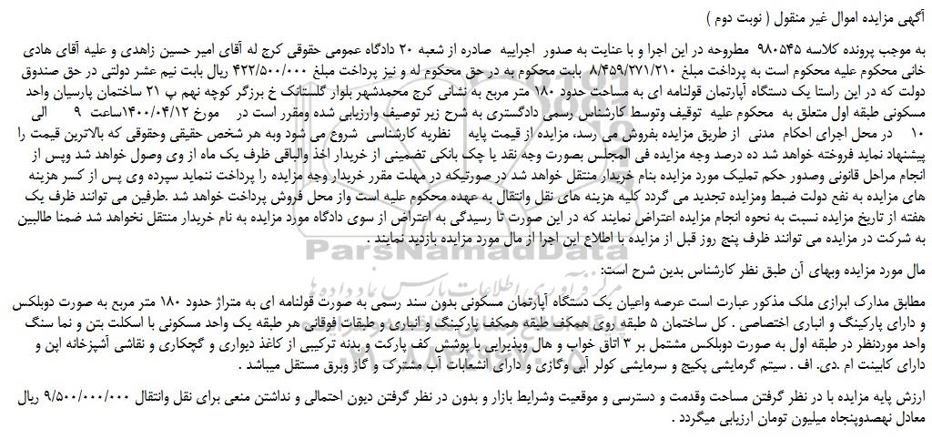 به موجب پرونده کلاسه 980545  مطروحه در این اجرا و با عنایت به صدور  اجراییه  صادره از شعبه 20 دادگاه عمومی حقوقی کرج له آقای امیر حسین زاهدی و علیه آقای هادی خانی محکوم علیه محکوم است به پرداخت مبلغ 8/459/271/210  بابت محکوم به در حق محکوم له و نیز پرداخت مبلغ 422/500/000 ریال بابت نیم عشر دولتی در حق صندوق دولت که در این راستا یک دستگاه آپارتمان قولنامه ای به مساحت حدود 180 متر مربع به نشانی کرج محمدشهر بلوار گلستانک خ برزگر کوچه نهم پ 21 ساختمان پارسیان واحد مسکونی طبقه اول متعلق به  محکوم علیه  توقیف وتوسط کارشناس رسمی دادگستری به شرح زیر توصیف وارزیابی شده ومقرر است در    مورخ 1400/04/12ساعت  9      الی  10    در محل اجرای احکام  مدنی  از طریق مزایده بفروش می رسد، مزایده از قیمت پایه    نظریه کارشناسی  شروع می شود وبه هر شخص حقیقی وحقوقی که بالاترین قیمت را پیشنهاد نماید فروخته خواهد شد ده درصد وجه مزایده فی المجلس بصورت وجه نقد یا چک بانکی تضمینی از خریدار اخذ والباقی ظرف یک ماه از وی وصول خواهد شد وپس از انجام مراحل قانونی وصدور حکم تملیک مورد مزایده بنام خریدار منتقل خواهد شد در صورتیکه در مهلت مقرر خریدار وجه مزایده را پرداخت ننماید سپرده وی پس از کسر هزینه های مزایده به نفع دولت ضبط ومزایده تجدید می گردد کلیه هزینه های نقل وانتقال به عهده محکوم علیه است واز محل فروش پرداخت خواهد شد .طرفین می توانند ظرف یک هفته از تاریخ مزایده نسبت به نحوه انجام مزایده اعتراض نمایند که در این صورت تا رسیدگی به اعتراض از سوی دادگاه مورد مزایده به نام خریدار منتقل نخواهد شد ضمنا طالبین به شرکت در مزایده می توانند ظرف پنج روز قبل از مزایده با اطلاع این اجرا از مال مورد مزایده بازدید نمایند .