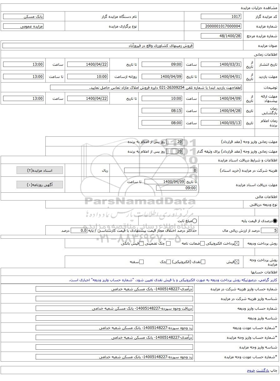 شماره حساب واریز وجه مزایده | درآمدی-14005148227- بانک مسکن شعبه خدامی |