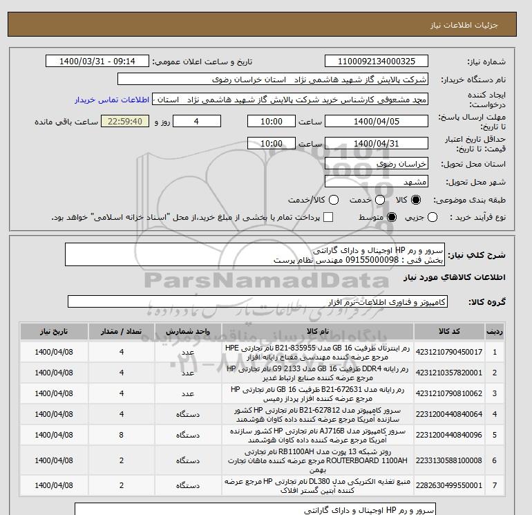 نام دستگاه خریدار:شرکت پالایش گاز شهید هاشمی نژاد استان خراسان رضوی