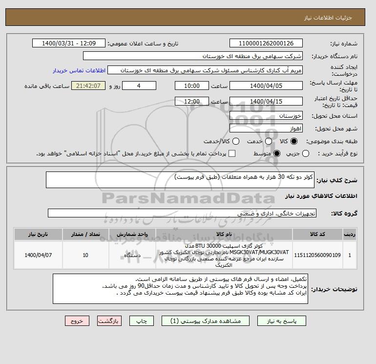 شرح کلی نیاز: کولر دو تکه 30 هزار به همراه متعلقات (طبق فرم پیوست)