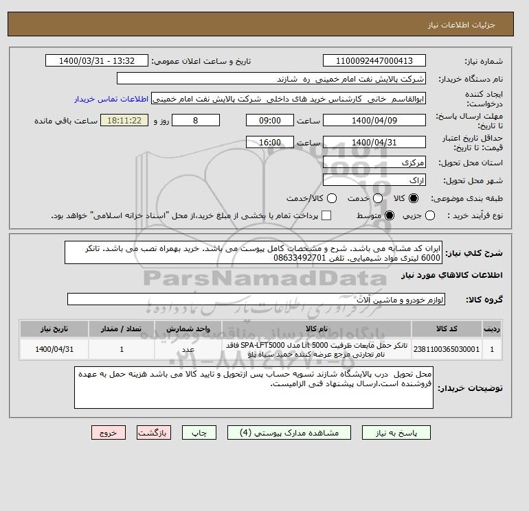 شرح کلی نیاز: ایران کد مشابه می باشد. شرح و مشخصات کامل پیوست می باشد. خرید بهمراه نصب می باشد. تانکر 6000 لیتری مواد شیمیایی. تلفن 08633492701