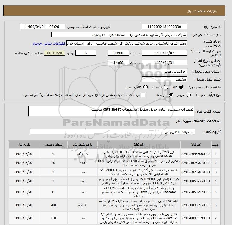 نام دستگاه خریدار:شرکت پالایش گاز شهید هاشمی نژاد استان خراسان رضوی