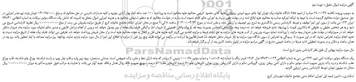 به موجب پرونده کلاسه 9901147 صادره از شعبه 255 دادگاه خانواده یک تهران لها: خانم مریم امیدی رودپشتی علیه: آقای محمود کریمی محکوم علیه محکوم است به پرداخت 110 عدد سکه تمام بهار آزادی مهریه و کلیه خسارات دادرسی در حق محکوم له و مبلغ 14/135/000 تومان بابت نیم عشر اجرایی در حق صندوق دولت محکوم گردیده است، با توجه به اینکه اجرائیه صادره به محکوم علیه ابلاغ شده و در مهلت مقرر نسبت به اجرای حکم اقدام ننموده است بنا به در خواست محکوم له به منظور استیفای محکوم به و هزینه اجرایی اموال متعلق به نامبرده که شامل یک دستگاه موتور سیکلت به شماره انتظامی 76841 ایران 124 می باشد، از سوی این اجرا توقیف و توسط کارشناس رسمی دادگستری به شرح زیر توصیف و ارزیابی شده و مقرر است در مورخ 1400/04/22 از ساعت 8 الی 9 صبح در محل اجرای احکام مجتمع خانواده کرج از طریق مزایده بفروش می رسد، از مبلغ 100/000/000 ریال نظریه کارشناسی شروع می شود و به هر شخص حقیقی و حقوقی که بالاترین قیمت را پیشنهاد نماید فروخته خواهد شد ده درصد وجه مزایده فی المجلس بصورت وجه نقد یا چک بانکی تضمینی از خریدار اخذ و الباقی ظرف یک هفته از وی وصول خواهد شد و پس از انجام مراحل قانونی و صدور حکم تملیک مورد مزایده بنام خریدار منتقل خواهد شد در صورتیکه در مهلت مقرر خریدار وجه مزایده را پرداخت ننماید سپرده وی پس از کسر هزینه های مزایده به نفع دولت ضبط و مزایده تجدید می گردد کلیه هزینه های نقل و انتقال به عهده محکوم علیه است و از محل فروش پرداخت خواهد شد. طرفین می توانند ظرف یک هفته از تاریخ مزایده نسبت به نحوه انجام مزایده اعتراض نمایند که در این صورت تا رسیدگی به اعتراض از سوی دادگاه مورد مزایده به نام خریدار منتقل نخواهد شد ضمنا طالبین به شرکت در مزایده می توانند ظرف پنج روز قبل از مزایده با اطلاع این اجرا از مال مورد مزایده بازدید نمایند. چنانچه روز مزایده مصادف با ایام تعطیل باشد روز بعد در همان ساعت و مکان و در صورت تعطیلی اداره صرفا در ساعت تعیینی مندرج در آگهی مراسم مزایده در اولین ساعت کاری بعد از آن برگزار خواهد شد .