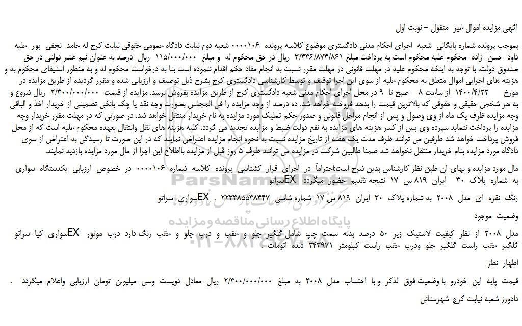 بموجب پرونده شماره بایگانی شعبه اجرای احکام مدنی دادگستری موضوع کلاسه پرونده 0000106 شعبه دوم نیابت دادگاه عمومی حقوقی نیابت کرج له حامد نجفی پور علیه داود حسن زاده محکوم علیه محکوم است به پرداخت مبلغ 3/436/874/861 ریال در حق محکوم له و مبلغ 115/000/000 ریال درصد به عنوان نیم عشر دولتی در حق صندوق دولت. با توجه به اینکه محکوم علیه در مهلت قانونی در مهلت مقرر نسبت به انجام مفاد حکم اقدام ننموده است بنا به درخواست محکوم له و به منظور استیفای محکوم به و هزینه های اجرایی اموال متعلق به محکوم علیه از سوی این اجرا توقیف و توسط کارشناسی دادگستری کرج بشرح ذیل توصیف و ارزیابی شده و مقرر گردیده از طریق مزایده در مورخ 1400/4/22 از ساعت 8 صبح تا 9 در محل اجرای احکام مدنی شعبه دادگستری کرج از طریق مزایده بفروش برسد. مزایده از قیمت 2/300/000/000 ریال شروع و به هر شخص حقیقی و حقوقی که بالاترین قیمت را بدهد فروخته خواهد شد. ده درصد از وجه مزایده را فی المجلس بصورت وجه نقد یا چک بانکی تضمینی از خریدار اخذ و الباقی وجه مزایده ظرف یک ماه از وی وصول و پس از انجام مراحل قانونی و صدور حکم تملیک مورد مزایده به نام خریدار منتقل خواهد شد. در صورتی که در مهلت مقرر خریدار وجه مزایده را پرداخت ننماید سپرده وی پس از کسر هزینه های مزایده به نفع دولت ضبط و مزایده تجدید می گردد. کلیه هزینه های نقل وانتقال بعهده محکوم علیه است که از محل فروش پرداخت خواهد شد طرفین می توانند ظرف مدت یک هفته از تاریخ مزایده نسبت به نحوه انجام مزایده اعتراض نمایند که در این صورت تا رسیدگی به اعتراض از سوی دادگاه مورد مزایده بنام خریدار منتقل نخواهد شد ضمنا طالبین شرکت در مزایده می توانند ظرف 5 روز قبل از مزایده بااطلاع این اجرا از مال مورد مزایده بازدید نمایند.