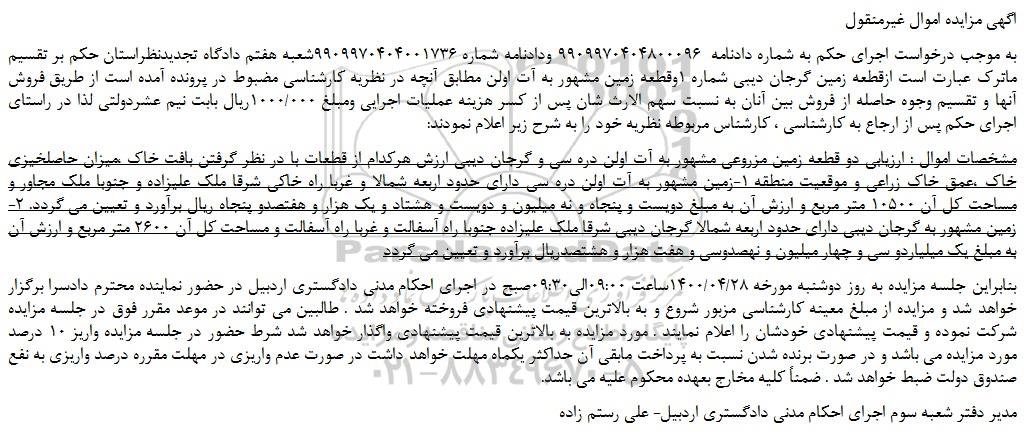 به موجب درخواست اجرای حکم به شماره دادنامه 9909970404800096 ودادنامه شماره 9909970404001736شعبه هفتم دادگاه تجدیدنظراستان حکم بر تقسیم ماترک عبارت است ازقطعه زمین گرجان دیبی شماره 1وقطعه زمین مشهور به آت اولن مطابق آنچه در نظریه کارشناسی مضبوط در پرونده آمده است از طریق فروش آنها و تقسیم وجوه حاصله از فروش بین آنان به نسبت سهم الارث شان پس از کسر هزینه عملیات اجرایی ومبلغ 1000/000ریال بابت نیم عشردولتی لذا در راستای اجرای حکم پس از ارجاع به کارشناسی ، کارشناس مربوطه نظریه خود را به شرح زیر اعلام نمودند: