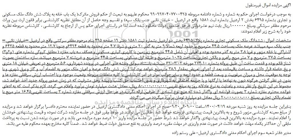 به موجب درخواست اجرای حکم به شماره و شماره دادنامه مربوطه 9909970407700425 محکوم علیهم به تبعیت از حکم فروش ماترک( یک باب خانه به پلاک شش دانگ ملک مسکونی و تجاری بشماره 6495 بخش 2 اردبیل بشماره ثبت 1581 واقع در اردبیل - خیابان نائبی جنب بانک سپه) و تقسیم وجه حاصل از آن مطابق نظریه کارشناسی برابر قانون ارث بین وراث مرحوم مظفر سرشکی ومبلغ 1000000ریال بابت نیم عشردولتی درحق صندوق دولت محکوم شده است لذا در راستای اجرای حکم پس از ارجاع به کارشناسی ، کارشناس مربوطه نظریه خود را به شرح زیر اعلام نمودند: