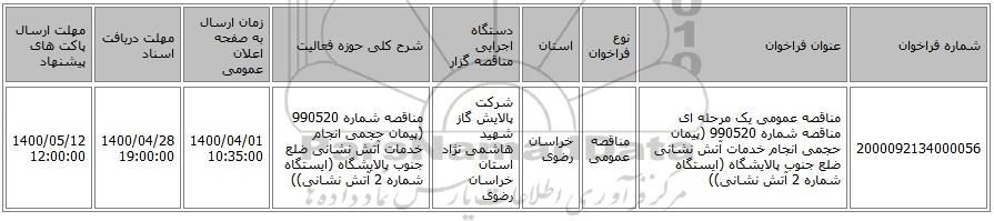مناقصه، مناقصه عمومی یک مرحله ای مناقصه شماره 990520 (پیمان حجمی انجام خدمات آتش نشانی ضلع جنوب پالایشگاه (ایستگاه شماره 2 آتش نشانی)), مناقصه عمومی یک مرحله ای مناقصه شماره 990520 (پیمان حجمی انجام خدمات آتش نشانی ضلع جنوب پالایشگاه (ایستگاه شماره 2 آتش نشانی))