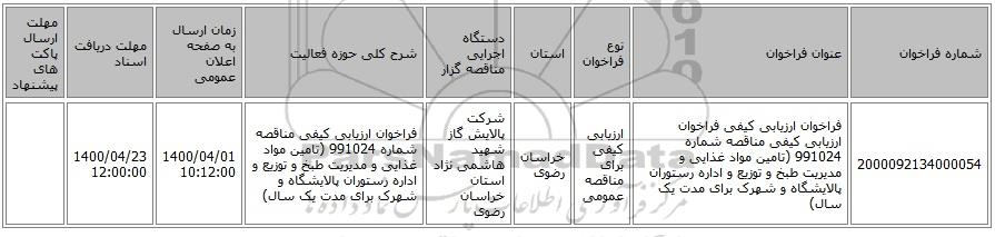 | 2000092134000054 | فراخوان ارزیابی کیفی فراخوان ارزیابی کیفی مناقصه شماره 991024 (تامین مواد غذایی و مدیریت طبخ و توزیع و اداره رستوران پالایشگاه و شهرک برای مدت یک سال) | ارزیابی کیفی برای مناقصه عمومی | خراسان رضوی | شرکت پالایش گاز شهید هاشمی نژاد استان خراسان رضوی | فراخوان ارزیابی کیفی مناقصه شماره 991024 (تامین مواد غذایی و مدیریت طبخ و توزیع و اداره رستوران پالایشگاه و شهرک برای مدت یک سال) | 1400/04/01 10:12:00 | 1400/04/23 12:00:00 |